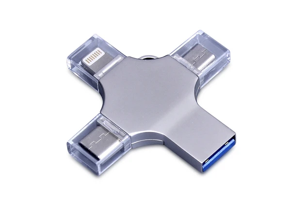 Функциональная серебристая флешка 4 в 1 c дополнительными разъемами Micro USB, Type-C и Lightning. Объем памяти на 128 Гб.