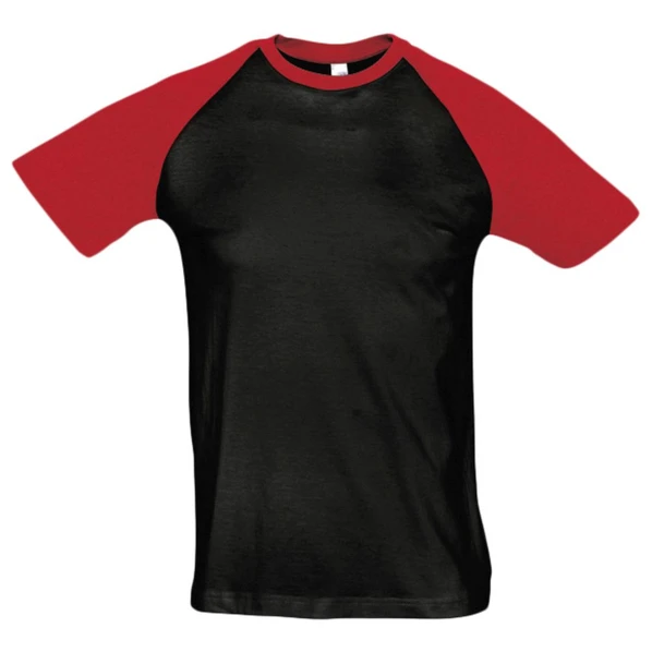 Черная футболка Funky 150 с красными рукавами реглан от бренда Sol's. Укрепляющая тесьма по вороту, край ворота — резинка с эластаном. Без боковых швов.