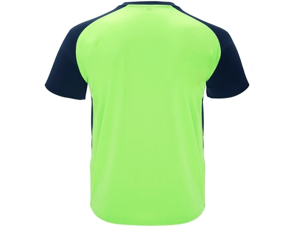 Спортивная салатовая футболка Roly Bugatti с коротким рукавом реглан. Модель с круглым вырезом горловины, контрастными черными рукавами и боковыми вставками. Дышащее технологичное полотно — 100% полиэстер. Оно легко стирается и быстро сохнет.
