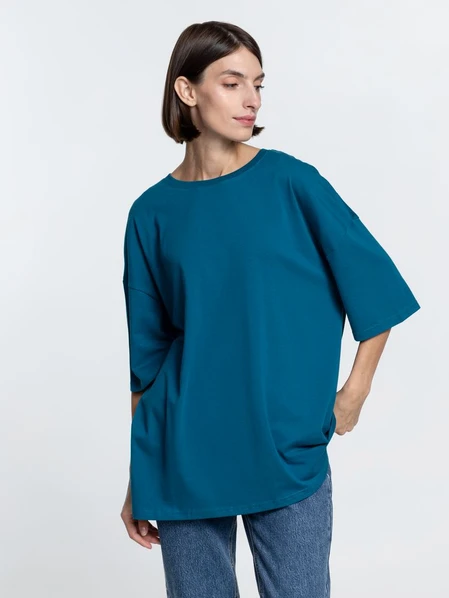 Объемная кроеная бирюзовая футболка Crosstown с удлиненным рукавом из гребенного хлопка с эластаном не стесняет движений и создает модный расслабленный силуэт.