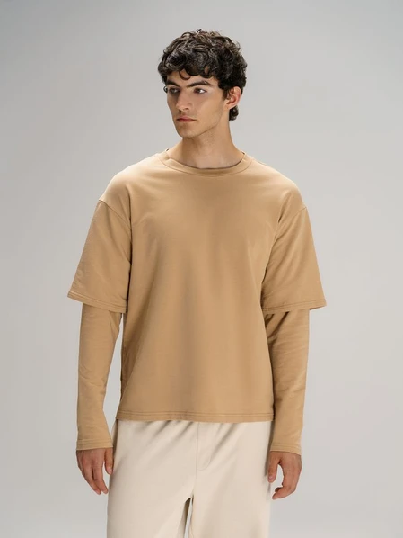 Бежевая футболка оверсайз в трендовом исполнении double sleeve (с двойным рукавом) — отличный вариант для создания повседневного образа. Легкая дышащая хлопковая ткань с гладкой трикотажной фактурой приятна к телу, а расслабленный оверсайз силуэт делает футболку Kosmos идеальной для любых жизненных маневров.