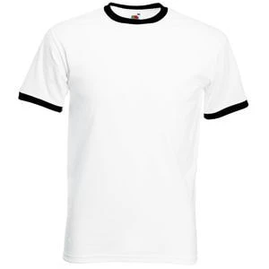 Удлиненная мужская футболка Ringer T 165 белого цвета с контрастной черной окантовкой рукавов и горлового выреза. Модель выпускается под брендом Fruit of the Loom.