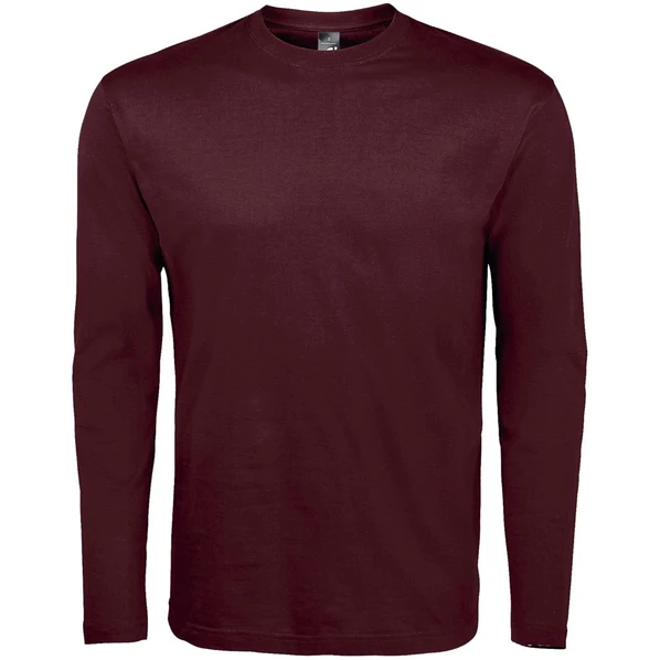 Бордовый лонгслив унисекс с круглым воротом. Укрепляющая тесьма по вороту, нижний край рукава без резинки. Без боковых швов.