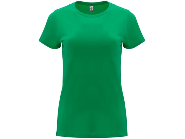 Женская приталенная ярко-зеленая футболка Capri производства бренда Roly. Круглый вырез горловины обработан рибом 1х1. Шов горловины укреплен тесьмой. Модель представлена в размерном ряде от S до 3XL.