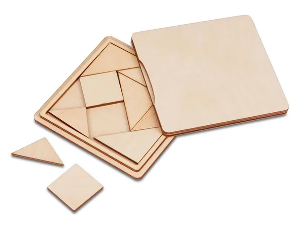 Важное уточнение: в комплект входит семь фигур разного размера, и при выкладывании какого-либо объекта должны использоваться все семь фигур! Игра выполнена из берёзовой фанеры, которая сделала игру лёгкой и прочной.