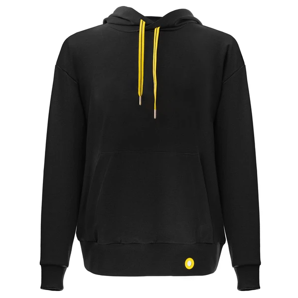 Объемное худи с накладным карманом кенгуру и декоративными элементами. Модель унисекс прямого силуэта со спущенной линией плеча.