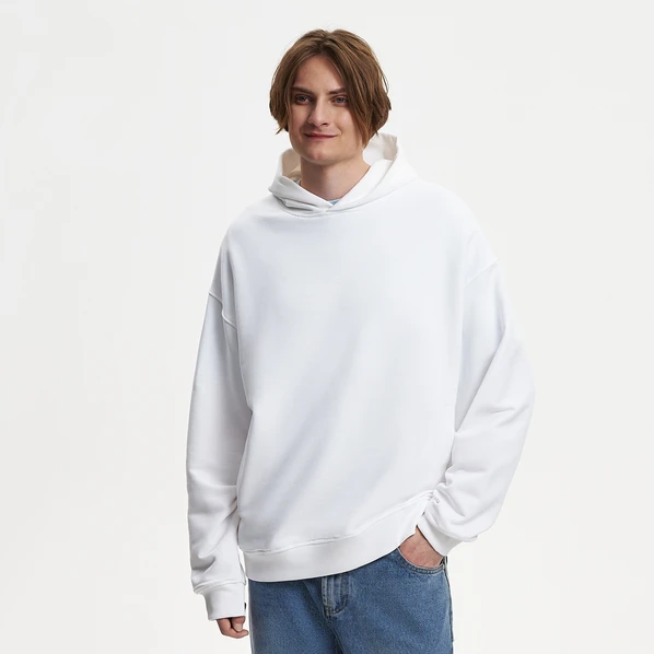 Модель выполнена из высококачественного белого хлопкового футера плотностью 380 г/м. Объёмная, но мягкая ткань комфортна для ежедневной носки.