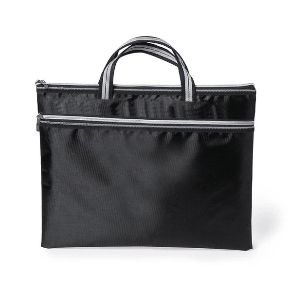 Черная сумка для документов с застежкой-молнией и передним карманом из мягкого полиэстера 300D с ручками для переноски оригинального двухцветного дизайна и молниями подходящего цвета.