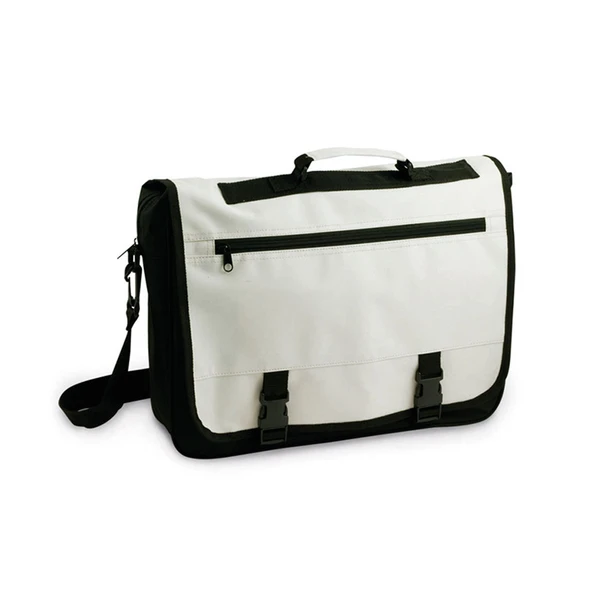 Бежевая сумка для документов из полиэстера 600D с клапаном на липучке и элегантной черной передней полосой. С усиленными ручками для переноски и регулируемым плечевым ремнем. Внутренние карманы для ручек и чехол для смартфона из ПВХ с тактильной функцией.