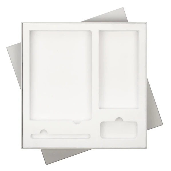 Подарочная серая упаковка с EVA ложементом обеспечивает расширенный выбор аксессуаров: конструкторская особенность ложемента позволяет использовать его под все виды зарядных устройств. Универсальные вырубные ячейки в точности повторяют форму аксессуаров, фиксируя их положение в коробке и обеспечивая сохранность набора. А флокированный материал ложемента, фактура которого напоминает бархат, удачно сочетается со всеми комплектующими.