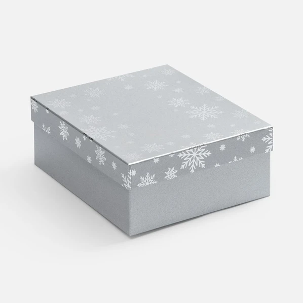 Серебристая коробка выполнена из переплетного картона толщиной 1,5 мм, кашированного бумагой TPG с тиснением серебристой фольгой.