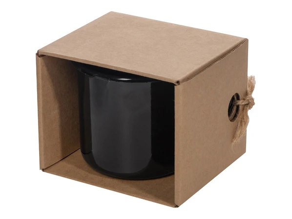 Эмалированная черная кружка поставляется в необычной упаковке — крафтовой коробке с открытой стенкой. Не беспокойтесь за комплектность — к упаковке кружка присоединена при помощи шпагата, продетого сквозь ручку и отверстия на углу коробки. Необычная подача создает первое впечатление от подарка, заставляя приглядеться к нему внимательнее.