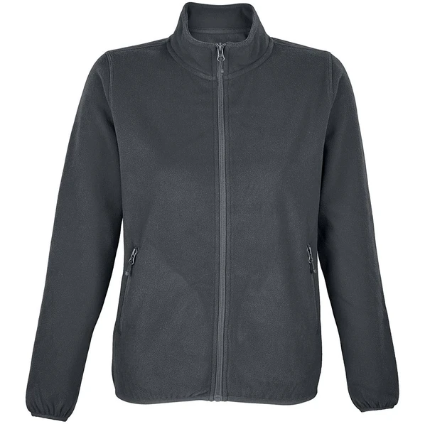 Флисовая женская куртка темно-серого цвета с воротником-стойкой.