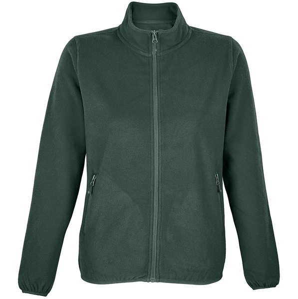 Флисовая женская куртка темно-зеленого цвета с воротником-стойкой.