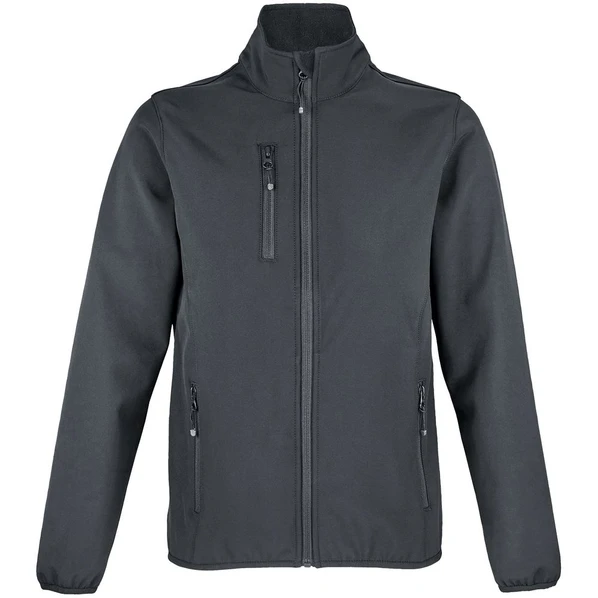 Женская темно-серая влагоустойчивая и ветрозащитная куртка из софтшелла с флисовой подкладкой.