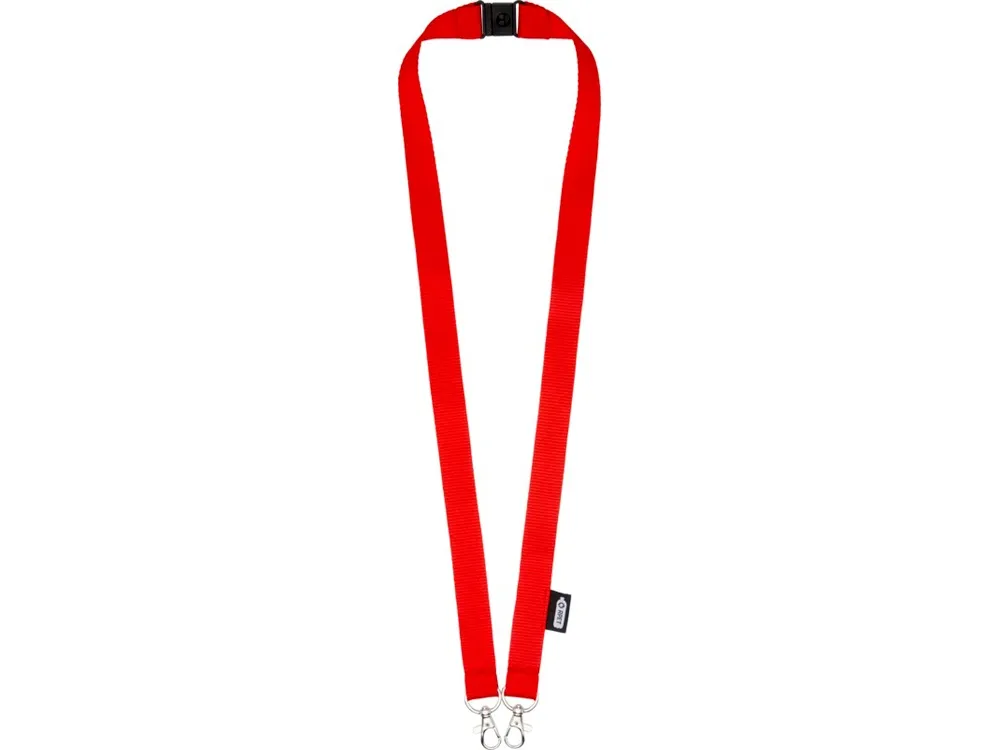 Красный ремешок из переработанного ПЭТ с фастексом для крепления защитной маски или бейджа. Поставляется с двумя высококачественными овальными крючками с карабином «лобстер».