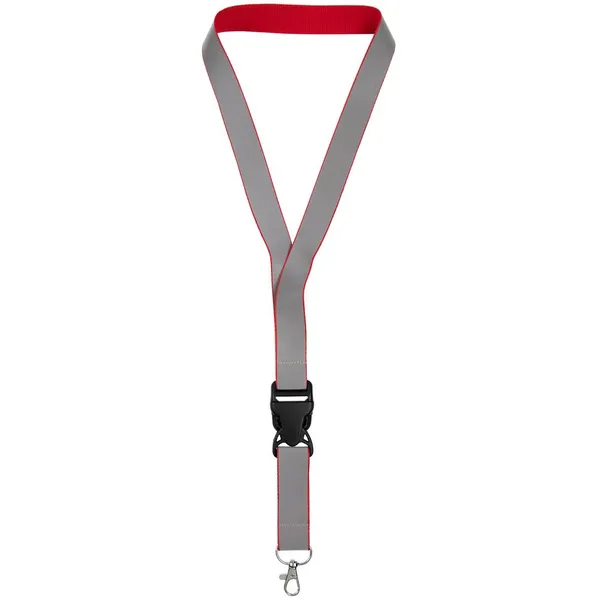Лента для бейджа или пропуска в красно-сером цвете с карабином и межъярусным замком. Такой замок позволит быстро отстегнуть часть ленты, чтобы приложить интерактивный бейдж или пропуск к считывателю, не снимая ленту через голову.