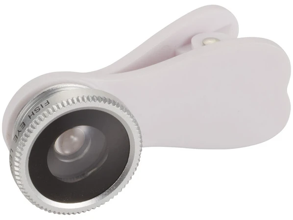Линза рыбий глаз с универсальным крепежным клипом серо-белого цвета. Изделие можно легко прикрепить к вашему смартфону, чтобы делать снимки с различной перспективой 180°. Такого типа линзы предоставляют сферическое изображение, что как бы помещает предметы и людей в шар.