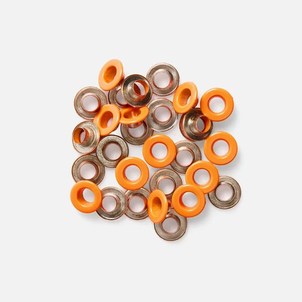 Люверс оранжевого цвета — вид фурнитуры для тканых изделий. Он подходит для материалов толщиной 1-2 мм, таких как бумага, картон, тонкие ткани. Аналогичен люверсам Ose, M. Их отличие только в длине ножки. Больший размер ножки дает возможность крепить люверсы к более плотным и толстым тканям.