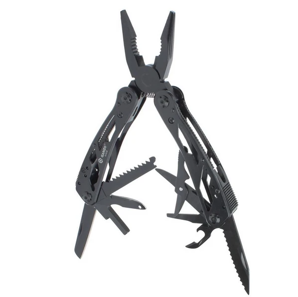 Полноразмерный черный мультитул с хорошим набором инструментов, который пригодится как во время поездок на природу, так и в городской среде.
