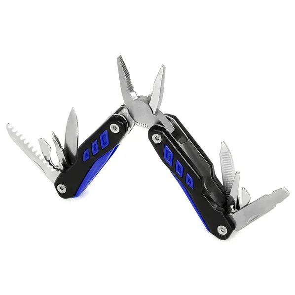 Плоскогубцы, кусачки, зубчатый нож, открывашка, крестовая отвёртка, нож, шлицевая отвёртка, консервный нож, малая отвёртка, напильник.