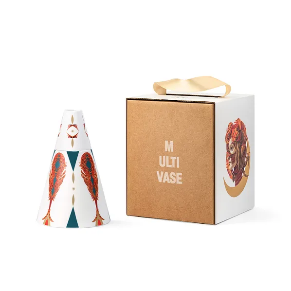 Мультиваза «Перья» из коллекции «Жар-птица» в подарочной коробке с матовой ламинацией и ручкой-лентой. Декорирование золотом. Объем вазы — 1200 мл.