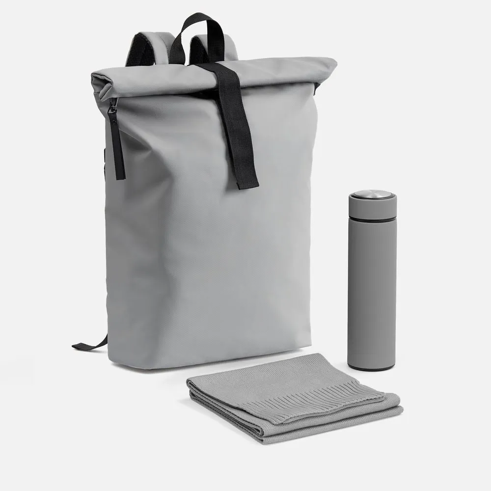Составляющие серого набора — шарф и термос — помогут оставаться стильным и, что немаловажно, довольным даже в холодное время года. Модный и практичный рюкзак с удобной регулировкой объема роллтоп всегда подстроится под ситуацию, а потому станет просто незаменим как ежедневно в городе, так и в путешествии.