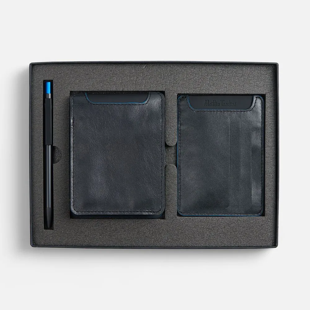 Подарочный черно-синий набор Arrival — практичный комплект для деловой среды. Аксессуары в едином стиле подойдут для хранения документов, карт и будут востребованы в повседневном использовании.