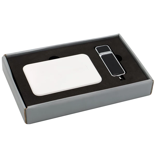 Подарочный белый набор в стильной цветной картонной коробке серого цвета с конструкцией крышка-дно. Внутри на аккуратном ложементе расположены внешний аккумулятор емкостью 5 000 mAh и элегантная флешка объемом 16 ГБ в корпусе с вставками из искусственной кожи.