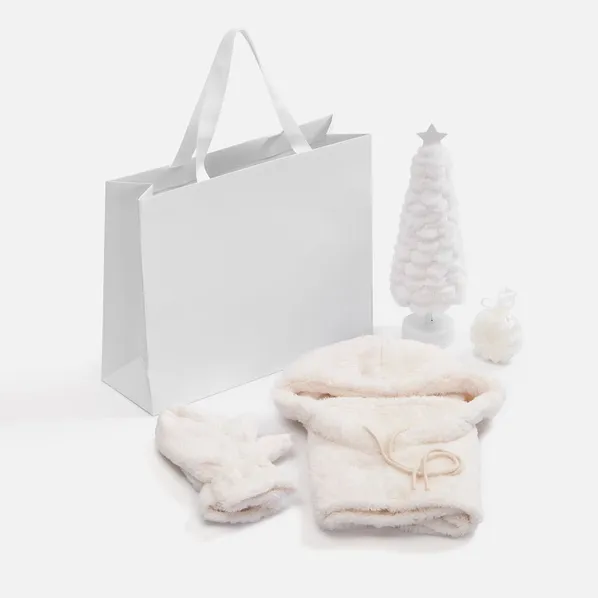Мягкие белые варежки и балаклава, светильник-елочка и свеча-снежинка — нежный и «пушистый» зимний набор.