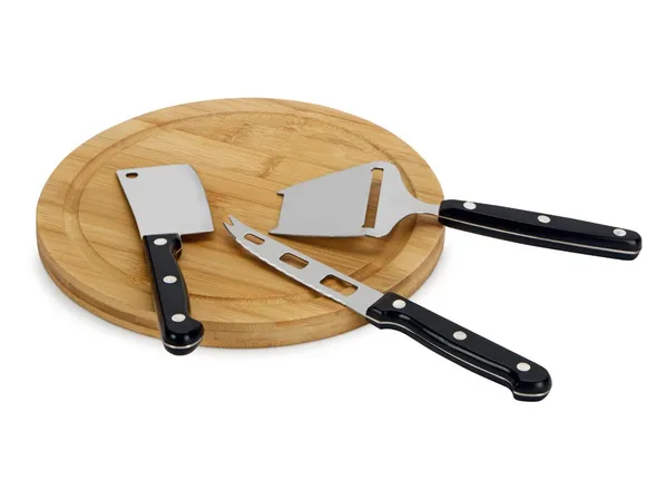 Набор для сыра не изменяет общему стилю Fabrizio: доска и три сырных ножа упакованы в чехол из искусственной кожи, который прекрасно сочетается по текстуре и цвету с другими изделиями серии. Чехол на молнии раскрывается как папка, надежно защищая принадлежности от механических повреждений и позволяя компактно и удобно хранить принадлежности. Для подвешивания и переноски предусмотрена текстильная петля на корешке. Внутри чехол имеет фиксирующие резинки для каждого ножа и доски. Три ножа позволяют грамотно подойти к подаче и сервировке практически любого сорта сыра.