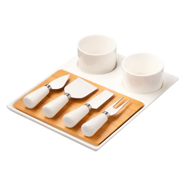 Набор подойдет для эстетичной сервировки и подачи любимых сыров или других закусок. Разные виды ножей помогут не смешать вкусы мягких свежих и твердых сыров. Соусницы идеально подойдут для меда или варенья. В набор вложена инструкция, благодаря которой легко разобраться в назначении каждого из ножей.