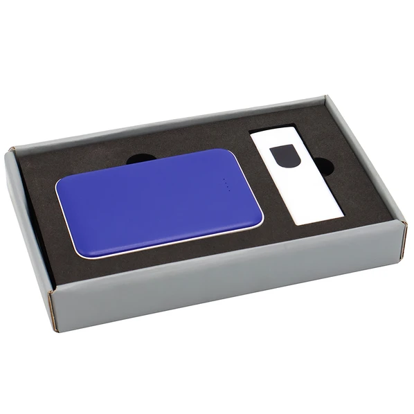 Подарочный синий набор в стильной картонной коробке. Внутри на аккуратном ложементе расположены внешний аккумулятор емкостью 5000 mAh и электронная зажигалка. Компактный и мощный внешний аккумулятор обеспечивает надежное подзаряжание мобильных устройств в любое время, а современная электронная зажигалка сочетает в себе удобство и безопасное использование без огня. Этот набор станет практичным и элегантным подарком для людей, ценящих функциональность и стиль.