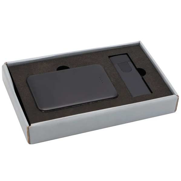 Подарочный черный набор в стильной картонной коробке. Внутри на аккуратном ложементе расположены внешний аккумулятор емкостью 5000 mAh и электронная зажигалка. Компактный и мощный внешний аккумулятор обеспечивает надежное подзаряжание мобильных устройств в любое время, а современная электронная зажигалка сочетает в себе удобство и безопасное использование без огня. Этот набор станет практичным и элегантным подарком для людей, ценящих функциональность и стиль.