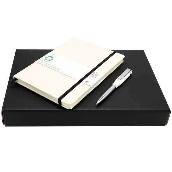 Подарочный белый набор в элегантной коробке черного цвета с конструкцией крышка-дно. Внутри расположен ложемент, специально разработанный для надежного и аккуратного размещения всех элементов набора.