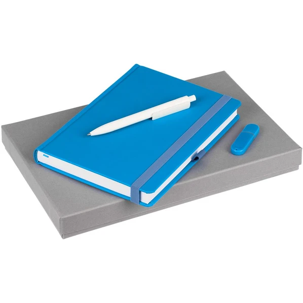 Функциональный голубой набор с недатированным ежедневником, флешкой и стильной шариковой ручкой, аккуратно размещенными в коробке с ложементом — удобное и эффектное решение для делового подарка.