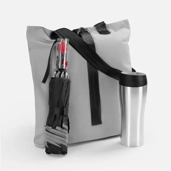 В серый набор Future Manifest входят необычный складной зонт наоборот и вакуумный термостакан с высокими показателями удержания температуры, упакованные в шопер из светоотражающей ткани, — идеальный аксессуар для комфортных и безопасных прогулок в любое время суток.