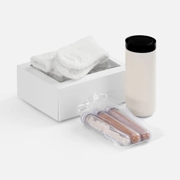 Домашний и такой уютный белый набор Heimen демонстрирует триумф тепла и комфорта. Чашка ароматного какао с нежными маршмеллоу в стильном термостакане, нежные объятия пушистых носков на ногах — то, что нужно для расслабляющего и умиротворяющего вечера.