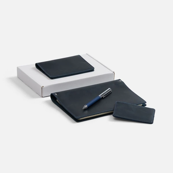 Подарочный синий набор выполнен в едином стиле и подойдет для рабочих задач, поездок и повседневного использования. Аксессуары помогают аккуратно хранить документы и карточки, а также вести ежедневные записи. Комплект можно использовать самостоятельно или включать в расширенный деловой набор.