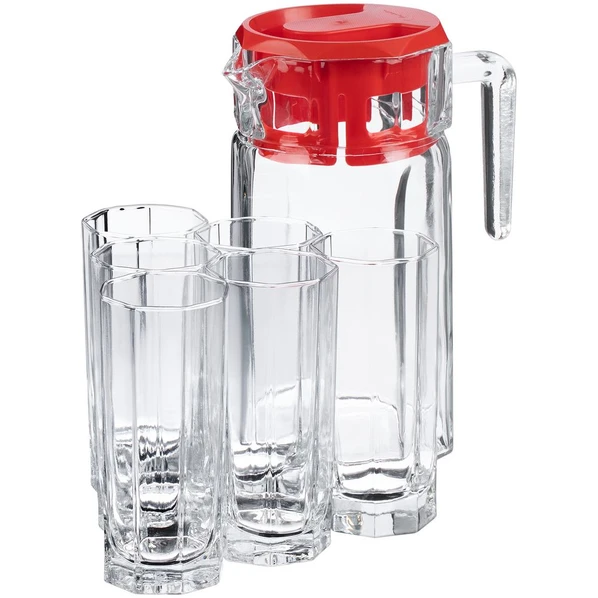 Набор Kosem из 6 стаканов и графина из прочного натрий-кальций-силикатного стекла. Рельефная многогранная поверхность стаканов идеально подходит для воды, сока и других напитков. Графин оснащен удобной пластиковой крышкой, которая плотно закрывается, — напиток не прольется случайно на стол.