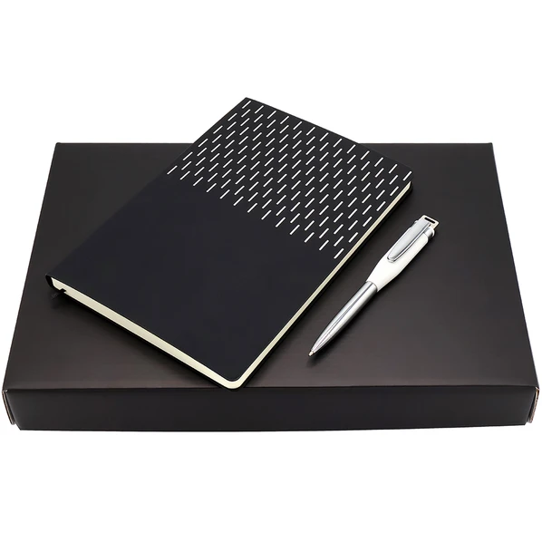 Подарочный белый набор в стильной картонной коробке. Внутри на аккуратном ложементе располагаются ежедневник А5 и элегантная металлическая ручка-флешка емкостью 64 ГБ.