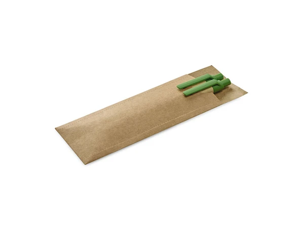 Набор Leaf состоящий из шариковой ручки и механического карандаша из крафт-бумаги. Оба с зажимом. Шариковая ручка с синими чернилами, а механический карандаш с графитом 0,5 мм.