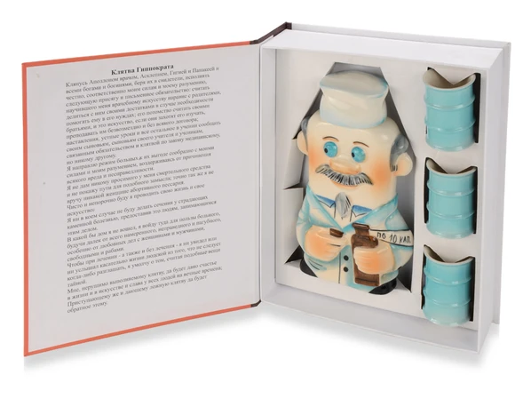 Настольная книга врача — это изящный и оригинальный фарфоровый набор, выполненный в виде книги. В комплект входят штоф и рюмочки, украшенные тематическими изображениями и деталями, связанными с медициной и врачебной практикой.