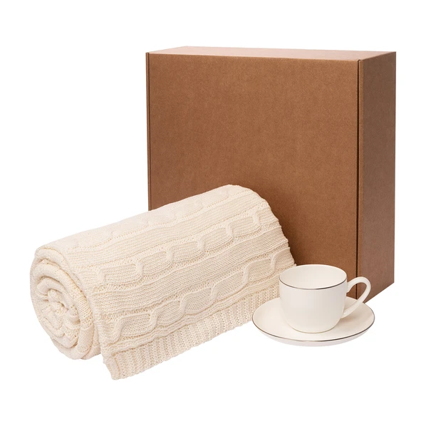 Подарочный бежевый набор Amelie, Fado — элегантное сочетание уюта и изысканности. Кофейная пара и мягкий вязаный плед создают атмосферу тепла и спокойствия, делая этот комплект отличным выбором для подарка.