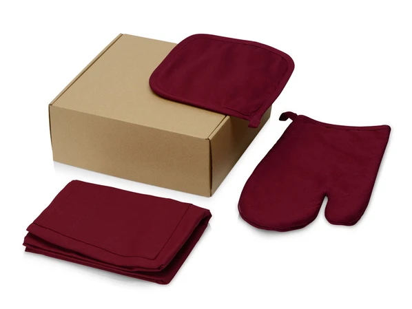 С подарочным набором Brand Chef любой повар, даже начинающий, имеет все шансы на успех: по крайней мере, обжечься или запачкать одежду благодаря прихваткам и фартуку точно не выйдет. Фартук имеет карман на животе, на который производится печать, а также поле для нанесения на груди. Посадку фартука можно регулировать при помощи ремешка вокруг шеи. Прихватка и рукавичка снабжены удобными петельками, за которые их можно подвесить на крючки.