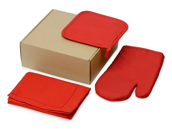 С подарочным набором Brand Chef любой повар, даже начинающий, имеет все шансы на успех: по крайней мере, обжечься или запачкать одежду благодаря прихваткам и фартуку точно не выйдет. Фартук имеет карман на животе, на который производится печать, а также поле для нанесения на груди. Посадку фартука можно регулировать при помощи ремешка вокруг шеи. Прихватка и рукавичка снабжены удобными петельками, за которые их можно подвесить на крючки.
