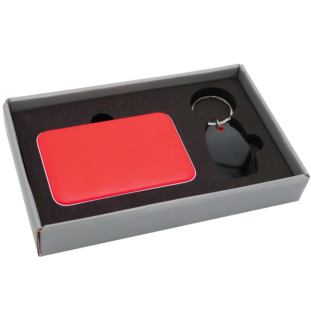 Подарочный красный набор в элегантной цветной картонной коробке серого цвета с конструкцией крышка-дно. Внутри расположены аккуратно закрепленные на ложементе внешний аккумулятор емкостью 5000 mAh и металлический карманный брелок.