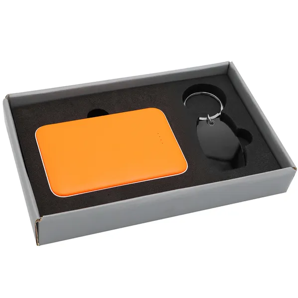 Подарочный оранжевый набор в элегантной цветной картонной коробке серого цвета с конструкцией крышка-дно. Внутри расположены аккуратно закрепленные на ложементе внешний аккумулятор емкостью 5000 mAh и металлический карманный брелок.
