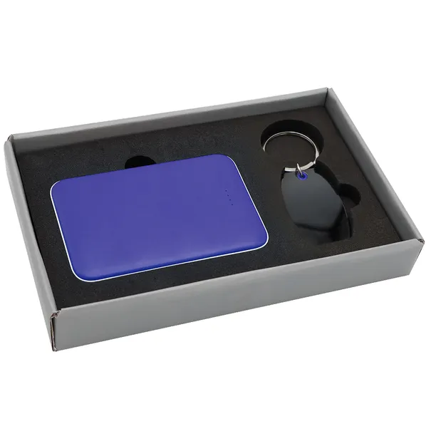 Подарочный синий набор в элегантной цветной картонной коробке серого цвета с конструкцией крышка-дно. Внутри расположены аккуратно закрепленные на ложементе внешний аккумулятор емкостью 5000 mAh и металлический карманный брелок.