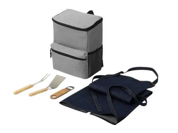 Плотный джинсовый фартук имеет большой вместительный карман. - лопатка с дополнительной открывалкой для бутылок; - лямки рюкзака регулируются для подгонки под практически любую фигуру.